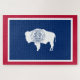 This design features the state flag of Wyoming, which is a doubly landlocked state in the western United States. It is the second most sparsely populated state in the country. Wyoming is bordered to the north by Montana, to the east by South Dakota and Nebraska, to the south by Colorado, to the southwest by Utah and to the west by Idaho and Montana. The official nickname of Wyoming is "Equality State", but it is also sometimes known as "Cowboy State" or "Big Wyoming". Wyoming's western half is mostly covered by the ranges of the Rocky Mountains, while the eastern half of the state is high-elevation prairie called the High Plains. Yellowstone national park is partially in Wyoming and Grand Teton national park is entirely within the state. Cheyenne is the state capital and the most populous city of Wyoming. The flag of the state of Wyoming includes a silhouette of an American bison. The red symbolises Native Americans and the blood of pioneers who gave their lives. The white is a symbol of purity and uprightness. The blue is the colour of the skies and distant mountains.