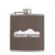 The flask itself is fine. It’s a cheap flask, obviously bought in bulk, however am prepared to overlook that. Given that it is a personalized item, I would have liked to have seen gift boxing instead of the generic packaging. Terrible printing, and/or quality. It’s a cheap, tacky vinyl. It is not cut straight and is also applied in a way that it is overhanging the bottom, causing the glue to catch on items and it will eventually roll and tear, damaging the wrap.