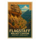 Retro travel poster of Flagstaff, Arizona showcasing Walnut Canyon cliff dwellings. Foreground: dramatic canyon cliffs with ancient stone dwellings built into the rock ledges, highlighted by warm sunlight. Midground: winding wooden trail descending into the canyon, with sparse desert trees and plants clinging to the rocky slopes