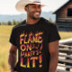 A fiery graphic design with the words Flame On Bro! Partys Lit in bold, stylised lettering with a flame design.
