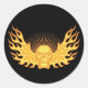Badass skull with hot-rod flame wings and righteous rays of light. Shades of gold, t-shirts, caps, stickers, gifts.
