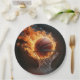 A basketball engulfed in flames is captured mid-air as it nears the hoop, emphasizing dynamic motion and intensity