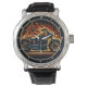 This close-up image features a striking watch face adorned with a powerful illustration. A custom chopper-style motorcycle, engulfed in vibrant orange and yellow flames, dominates the centre. The dark background enhances the fiery effect, while clear silver numbers and watch hands provide contrast, creating a bold and dynamic accessory for motorcycle enthusiasts.
