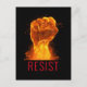 Social justice themed card features large fist of fire and flames with customizable "RESIST" text in red modern font on black background.