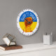 Show your support for Ukraine with this awesome wall clock featuring round cutout of Ukraine's flag with flaming fist and "Glory to Ukraine", one of the country's most popular slogans, in curved text.
