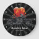 Hit the open road with a clock that reflects your love as a couple for your bike(s). A graphic outlined motorcycle is accented by a flaming heart against a rich black grungy burst background. Add your name(s), special date or any message below. Available with matching products.