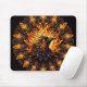 Captivating circular graphic featuring a vibrant phoenix in mid-resurrection, its fiery plumage radiating with intense oranges and yellows against a stark black background, symbolising rebirth and immortality.
