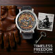 This close-up image showcases a distinctive watch face with a bold, fiery illustration. A vintage-style motorcycle with a sidecar, both adorned with vibrant orange and yellow flames, dominates the centre. Large, feathered wings extend from the motorcycle's back. The dark background highlights the fiery design, creating a dynamic and striking timepiece.