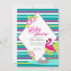 Graphic stripe and pink flamingo, let's flamingle baby shower invitations. Cute whimsy graphic pink flamingos and baby flamingo graphic baby shower invites in pink,, white, aqua blue and green. Original graphic art and design by Sarah Trett.
