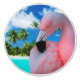 Amazing wildlife birds, flamingos. Pink flamingo, sea, palms and tropical beach.