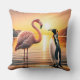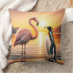 A surreal scene capturing a flamingo and penguin side by side, casting long shadows on a shimmering waterfront at sunset.