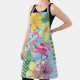 Beautiful, pink flamingo in combination with colourful, watercolor, tropical flowers. Luau, adorable, blue stripe pattern, summer apron.