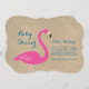 Elegant ribbon script and a bright pink flamingo on a beach sand background, decorate this baby shower invitation, making it perfect for a summertime, poolside or flamingo themed shower.