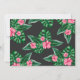 Baby shower invitation design features pink flamingo with lush green palm leaf fronds and tropical hibiscus flowers. "Aloha Baby". A tropical floral pattern with black background colour dresses up the back of the card.