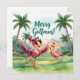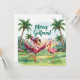 Celebrate the holidays with a playful twist on golf! This watercolor card features a pink flamingo dressed as a golfer, wearing a Santa hat, standing on a lush green golf course decorated for Christmas. The fairways are adorned with flamingo, and holiday lights on palm trees, creating a fun and festive scene. Handwritten text “Merry Christmas” adds a cheerful touch. Perfect for golf enthusiasts, Florida fans, or anyone who loves whimsical holiday designs.