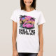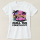his light-coloured t-shirt features a vibrant pink flamingo relaxing in a pool of water. The flamingo sports cool sunglasses with an American flag design, perfectly capturing a festive Fourth of July vibe. Palm trees and a colourful sunset create a tropical backdrop. Below the image, the text "CHILL THE FOURTH OUT" is displayed in bold, black lettering. Show your patriotic spirit with this fun and summery tee!