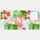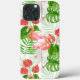 Watercolor pattern design with flamingo flowers and birds, monstera and palm leaves.