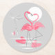 A pair of pink flamingos with necks curved to form a heart shape stand in the sea on a moonlit beach. A stylish, romantic design with a retro touch created in a pink, grey and white colour scheme with a colour-change background. A customisable design for you to personalise with your own text, images and ideas. An original digital art image.