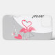 A pair of pink flamingos with necks curved to form a heart shape stand in the sea on a moonlit beach. A stylish, romantic design with a retro touch created in a pink, grey and white colour scheme with a colour-change background. A customisable design for you to personalise with your own text, images and ideas. An original digital art image.