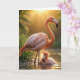 A majestic flamingo stands gracefully in shallow water, with her baby chick nestled comfortably beside it.