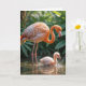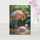 A vibrant scene features a tall flamingo standing beside its chick as it splashes in the water, surrounded by lush green foliage.