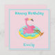 Pink Flamingo on a Pool Ring on a Pink background Birthday Card. Designed by Jacqueline. Personalized by You. All aspects of the designed can be edited to suit. If you need help with this just drop me a message.