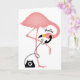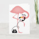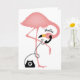 A greeting card featuring an illustration of a flamingo with neck curved down. Flamingo is talking on a rotary style phone. Personalise the greeting above flamingo's head.