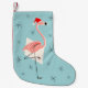 Mid-century inspired design with a retro touch featuring a pink flamingo wearing a Santa hat, cream geometric shape, and stars on a blue (colour change) background. A customisable design for you to personalise with your own text, images and ideas. An original digital art image created by QuirkyChic.