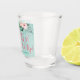 Shot glass with tropical florals and flamingo design for a Let's Flamingle Bachelorette Party. Design features turquoise ombre background and watercolour flamingo and floral bouquet.