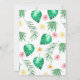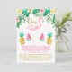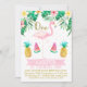 Sweet flamingo themed first birthday invitation featuring some tropical foliage, flower and fruit on a white background. The design also includes a pink watercolor banner. This design will set the scene for your little girl's flamingo themed tropical first birthday party.