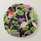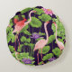 Flamingo, tropical plants, black background. round cushion