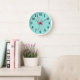 This round shape wall clock is shown with a cute pink flamingo art print.