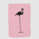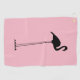 This silly golf towel design features a black coloured silhouette/shadow of a flamingo with unreasonably long legs, on a pink coloured background.