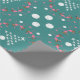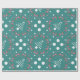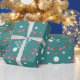 Coastal Christmas wrapping paper on a roll. Quality, heavy duty gift wrap has a unique design with flamingos, sand dollars and starfish printed on a blue-grey background. Christmas tree images are made of white starfish with a sand dollar base. Circular pattern in pink and white beach-themed design.