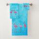 Pink flamingoes bath towel set in blue water design. Perfect for a beach house, or vacation condo, in the tropics. Buy separately or as a set.