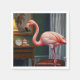 "Flamingo's Cosy Corner" captures a graceful flamingo standing elegantly beside a vintage wooden table adorned with a classic tea set, clock, and lamp. The warm, nostalgic ambiance blends charm and sophistication in a serene indoor setting.