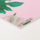 Beautiful illustration of a flamingo in flight with exotic leaves and flowers with a pink glittering background. Fairy tale design