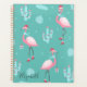 Pink flamingos with Santa hat, presents, and snowflakes on a mint green background.