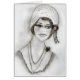 A fun black and white pencil sketch of a 1920's Art Deco Flapper Girl in a beautiful cap with beads hanging down off a flower and several beaded necklaces.