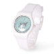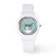 Beautiful Ladies' Flat Earth Map Watch in Turquoise 'Sea' with White 'South Ice' Ring and 'Polar' White Bezel, Hour & Minute Hands, and Strap. Image Depicts the Light & Movement of the Sun around the Flat Surface of the Earth and World Continents. Available in Black or White Watch Band.