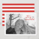 Joy to the World holiday photo cards featuring the words "joy to the world", in red / black handwritten like typeface overlay, and a white border framing a picture template of cute girl blowing soap bubbles (black and white photo template). A festive nautical design, with a red and white horizontal stripes pattern, adornes the back of these Joy to the World Christmas photo cards.