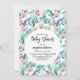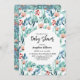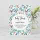 Flat lay baby shower invitation card featuring adorable watercolor plant images with soft pastel emerald and blue leaves, branches, and soft pink flowers.