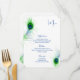 This Menu Card template is shown on the basic white paper with a lovely peacock print. Script and standard text in Blue.