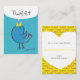 Color palette: aqua blue background, blue bird, sunshine yellow beak, white speech bubble, and charcoal gray outline.