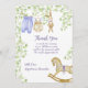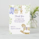 Flat Thank You Baby Shower Card features beautiful watercolor illustrations of cute baby clothes hanging on a line to dry, a cute stuffed bunny, an adorable rocking horse at the bottom of the card, and all of these items are surrounded by delicate branches with light green leaves.
