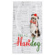 A tricolor Australian Shepherd sits with a cute red Santa hat and a red and white striped scarf is ready to wish Fleas Navidog to any dog lover or pet lover who adores the Aussie breed.