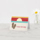 A notecard featuring an illustration of a 70s inspired sunset at top half. Illustration of brown flip flops at bottom left. Personalize with your name in red to the right of the flip flops. look for matching items at Jill's Paperie.