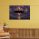 An immense floating island crowned by a grand, spired castle city gleams amid turbulent purple-orange clouds, with powerful golden light beams pouring downward to touch a serene ocean surface. Stars scatter across the night sky while a low sunset horizon warms the edges in peach and rose, creating layers of depth, mystery, and radiant energy. The composition evokes mythic grandeur, cosmic power, ancient legends reborn, sublime wonder, and the thrill of impossible realms—perfect for fantasy bedrooms, gaming rooms, meditation spaces, home offices, modern minimalist walls, or as awe-inspiring gifts for dreamers, fantasy enthusiasts, spiritual seekers, or anyone drawn to epic scale, surreal beauty, and transformative imagination.
