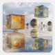 Reflective cubes and spheres hover above a serene water surface. The background features a bright sky with scattered clouds, creating a surreal atmosphere.