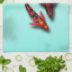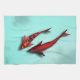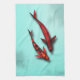Featuring a pair of vividly coloured red and orange Koi fish, floating serenely over a pale aquamarine background.